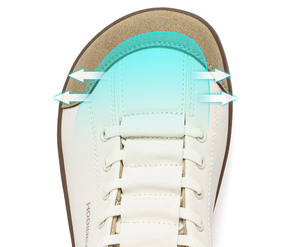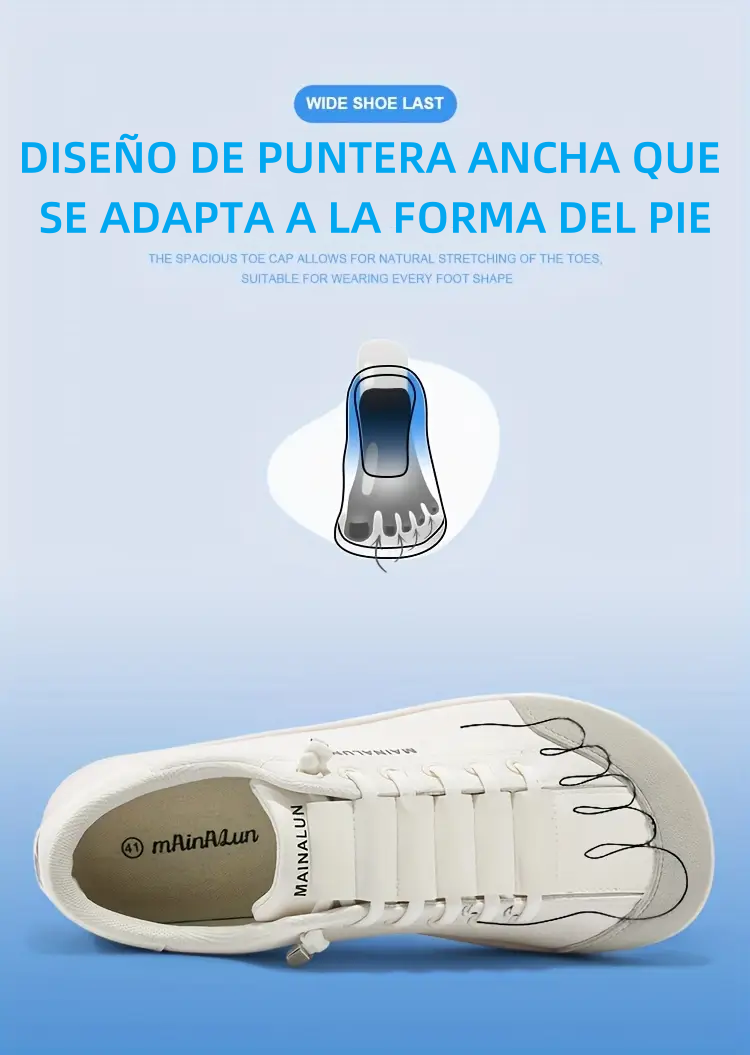 El diseño de puntera ancha proporciona más espacio para los dedos, reduciendo la presión. Los dedos se estiran naturalmente, lo que favorece la circulación sanguínea y facilita estar de pie o caminar durante largos periodos.